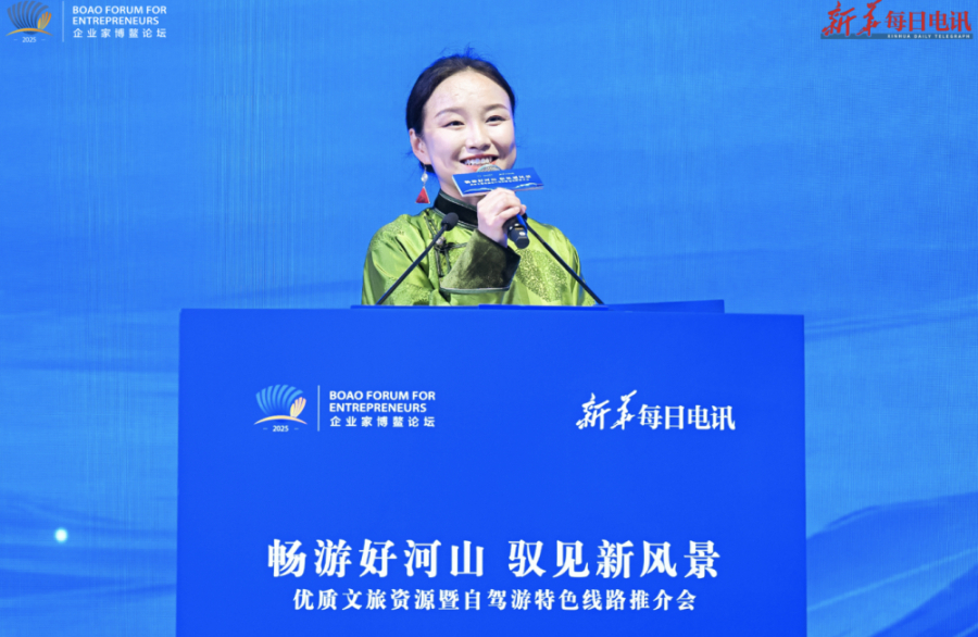 12月5日,克什克腾旗乌兰牧骑副队长何雨佳在2025中国企业家博鳌论坛“歌游内蒙古 欢乐冰雪季”内蒙古冬季旅游主题传播推广活动上作推介。新华网发