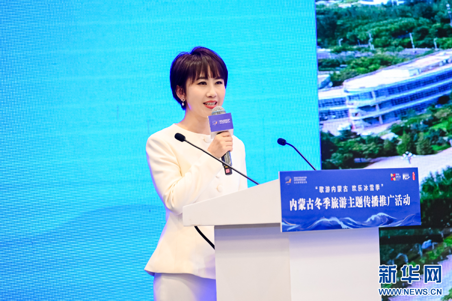 12月5日,锡林郭勒盟文旅推介官宝丽娜在2025企业家博鳌论坛“歌游内蒙古 欢乐冰雪季”内蒙古冬季旅游主题传播推广活动中作推介。新华网发