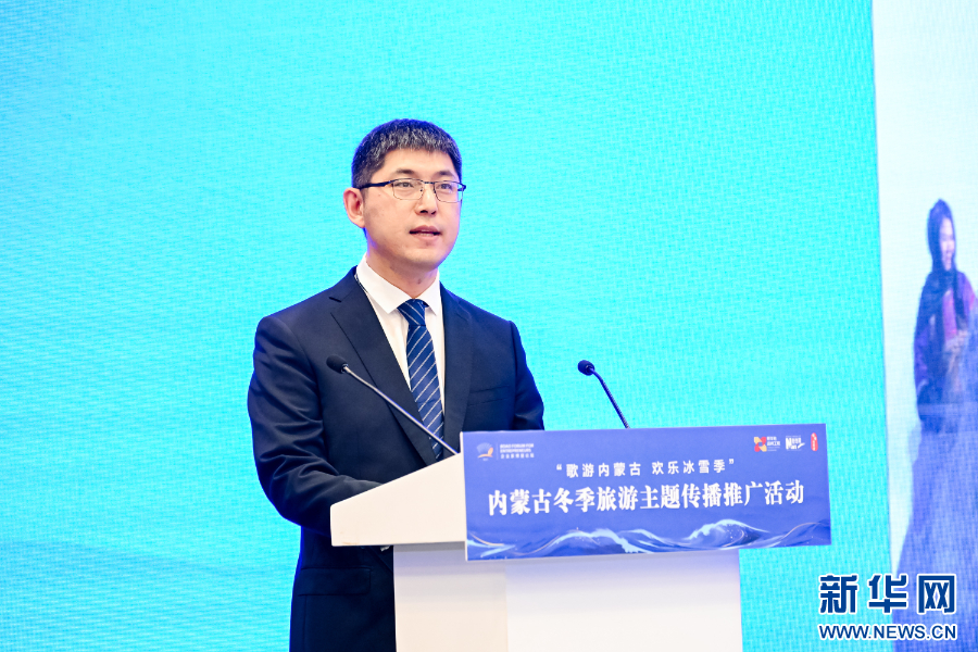 12月5日,鄂尔多斯市文化和旅游局推介官王涛在2025企业家博鳌论坛“歌游内蒙古 欢乐冰雪季”内蒙古冬季旅游主题传播推广活动上作推介。新华网发