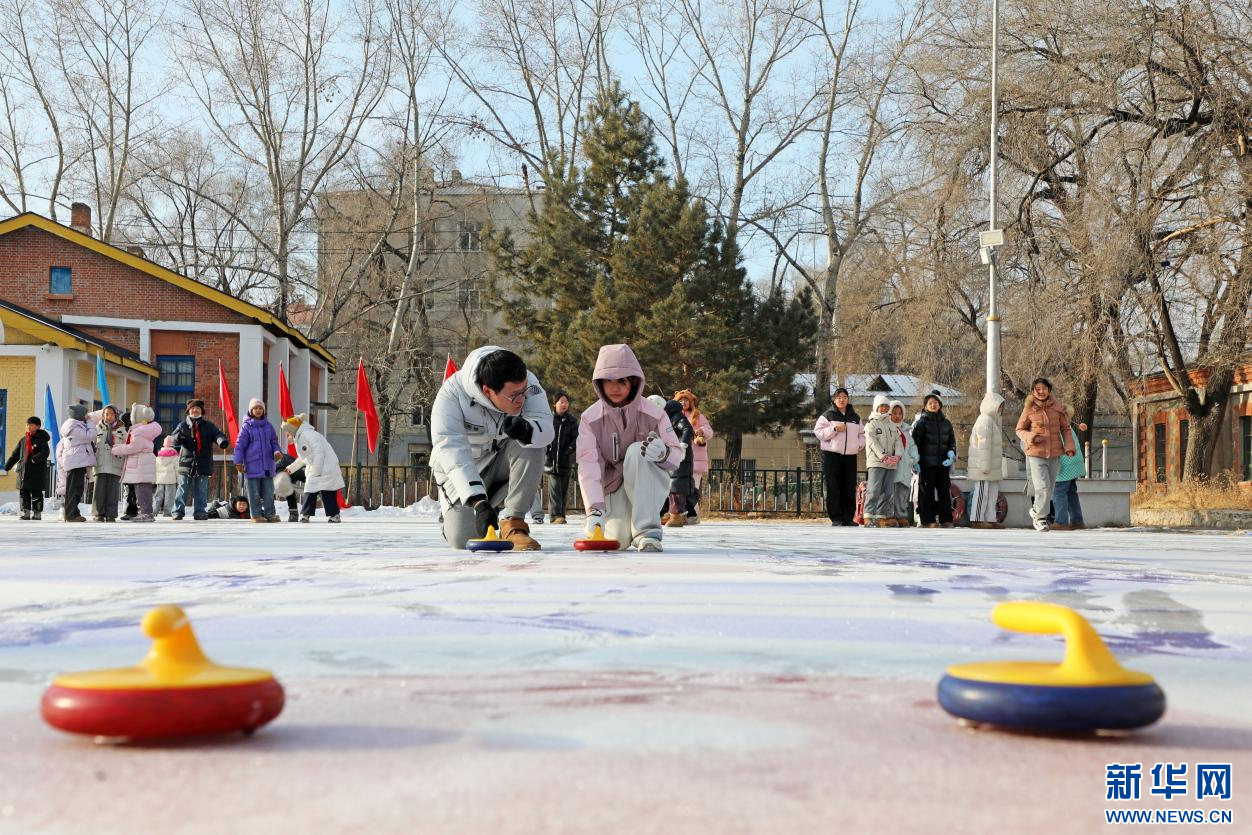 12月18日,在内蒙古自治区呼伦贝尔市扎兰屯市实验小学滑冰场,学生们在“冰雪课堂”学习掷冰壶。新华网发(韩颖群 摄)