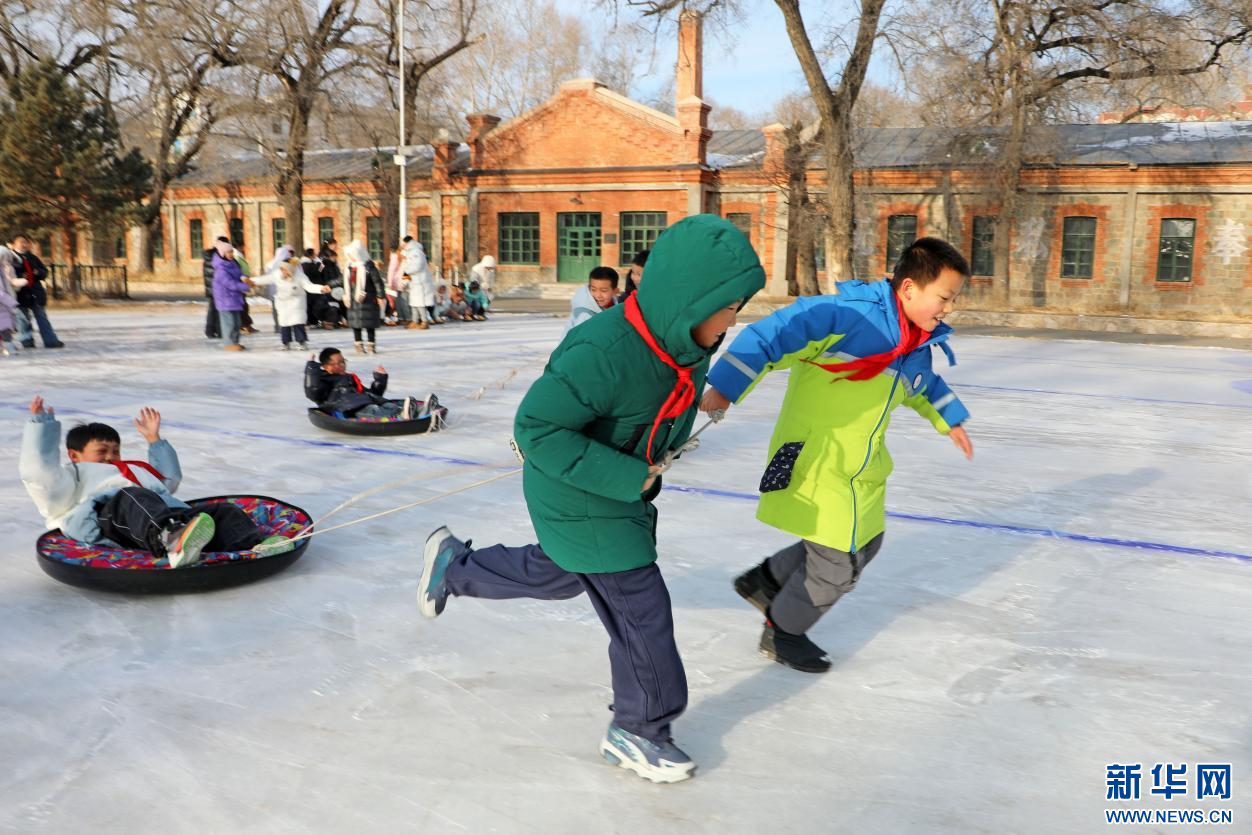 12月18日,在内蒙古自治区呼伦贝尔市扎兰屯市实验小学冰场,学生们在“冰雪课堂”进行拉雪圈比赛。新华网发(韩颖群 摄)