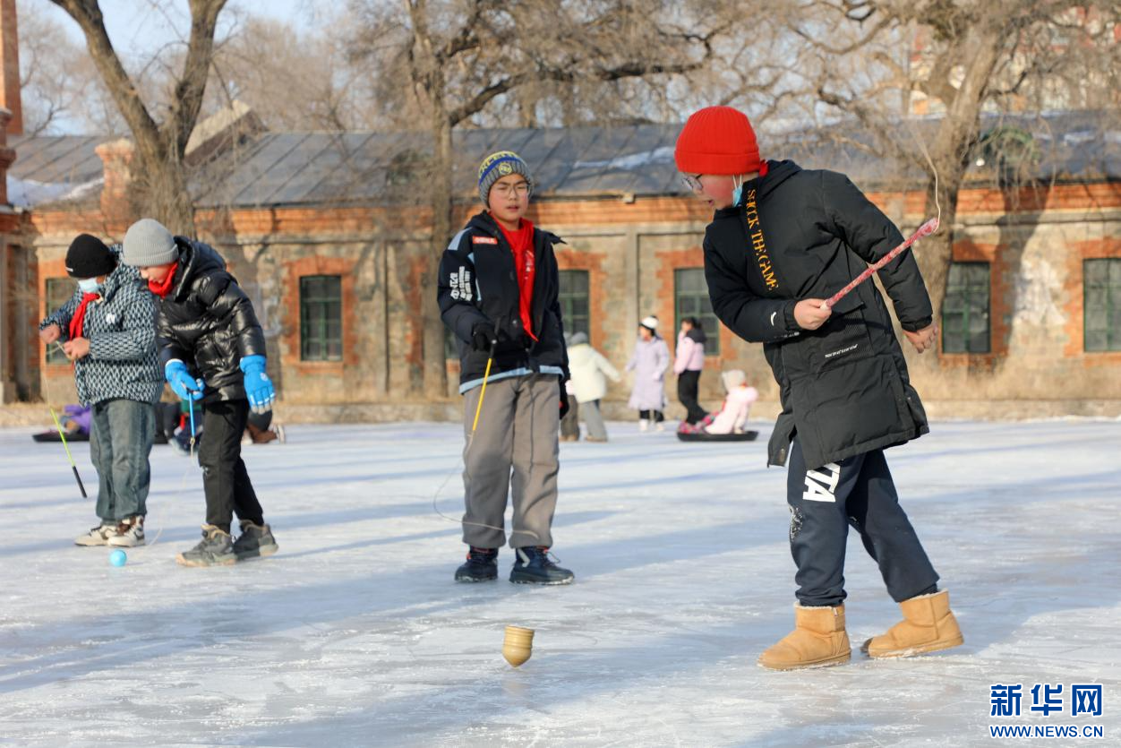 12月18日,在内蒙古自治区呼伦贝尔市扎兰屯市实验小学冰场,学生们在“冰雪课堂”上打冰嘎。新华网发(韩颖群 摄)