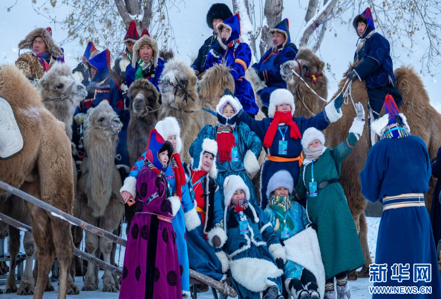 12月21日,参加第二十一届内蒙古自治区冰雪那达慕开幕仪式的演员在呼伦贝尔市海拉尔区伊敏河文化休闲长廊拍照。新华网发(吕昊俊 摄)