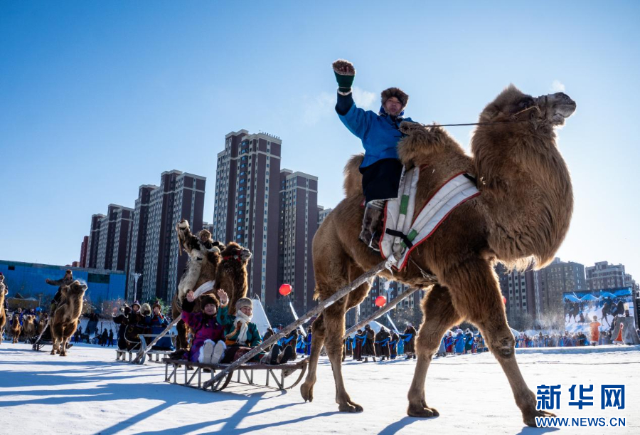 12月21日,参加第二十一届内蒙古自治区冰雪那达慕开幕仪式的驼队。新华网发(吕昊俊 摄)