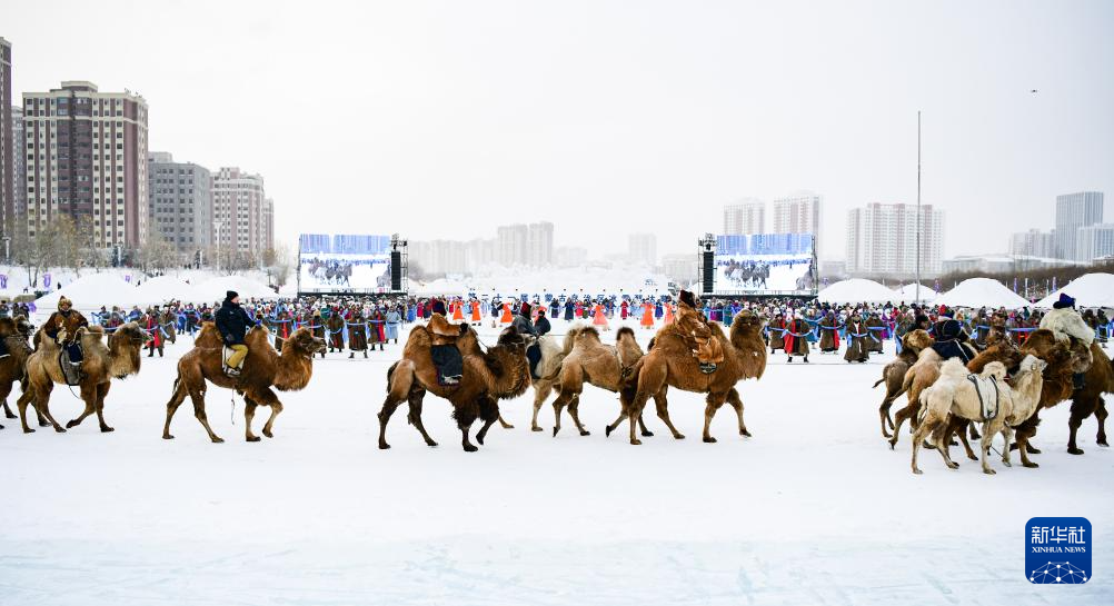 12月20日,参加开幕式彩排的驼队入场。