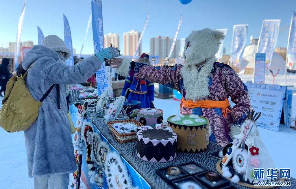 12月21日,游客在第二十一届内蒙古自治区冰雪那达慕开幕式现场购买特色产品。新华网 李倩摄