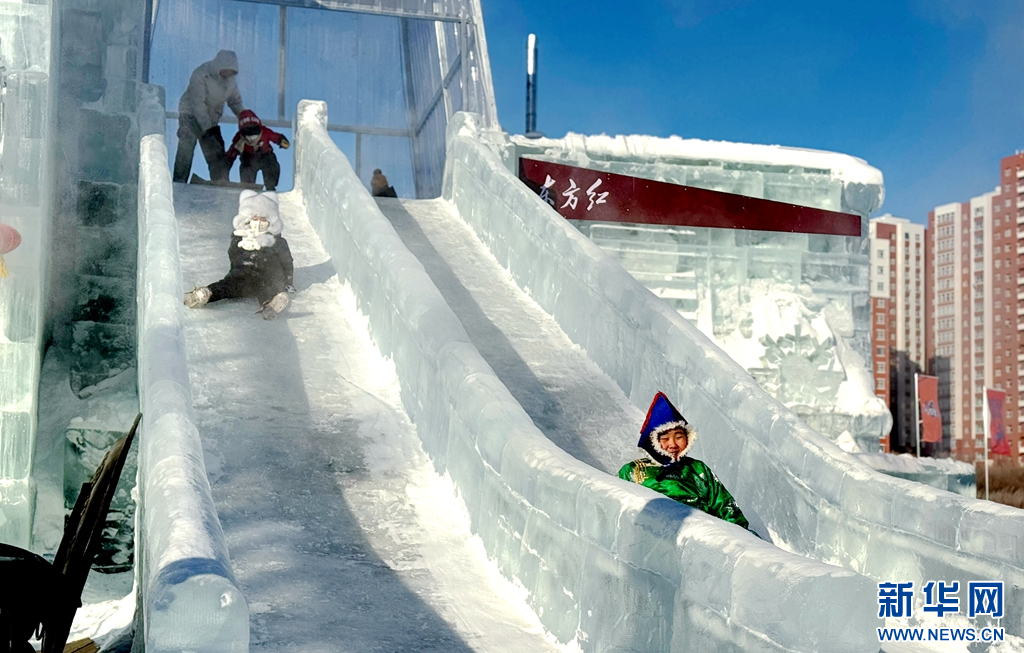 12月20日,市民、游客在呼伦贝尔绒绒雪世界冰滑梯游玩。新华网 李倩摄
