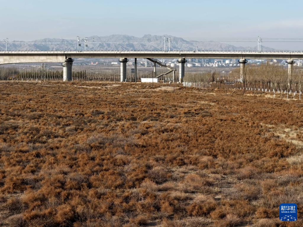 这是12月11日拍摄的包银高铁二道坎跨京藏高速特大桥,桥下是内蒙古西鄂尔多斯国家级自然保护区乌海片区(无人机照片)。新华社记者 李志鹏 摄