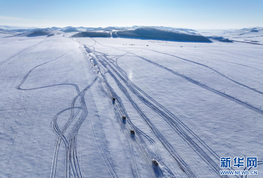12月23日,在内蒙古冰雪英雄会额尔古纳站林海雪原穿越赛段,参赛车辆在进行比拼。新华网发(吕昊俊 摄)