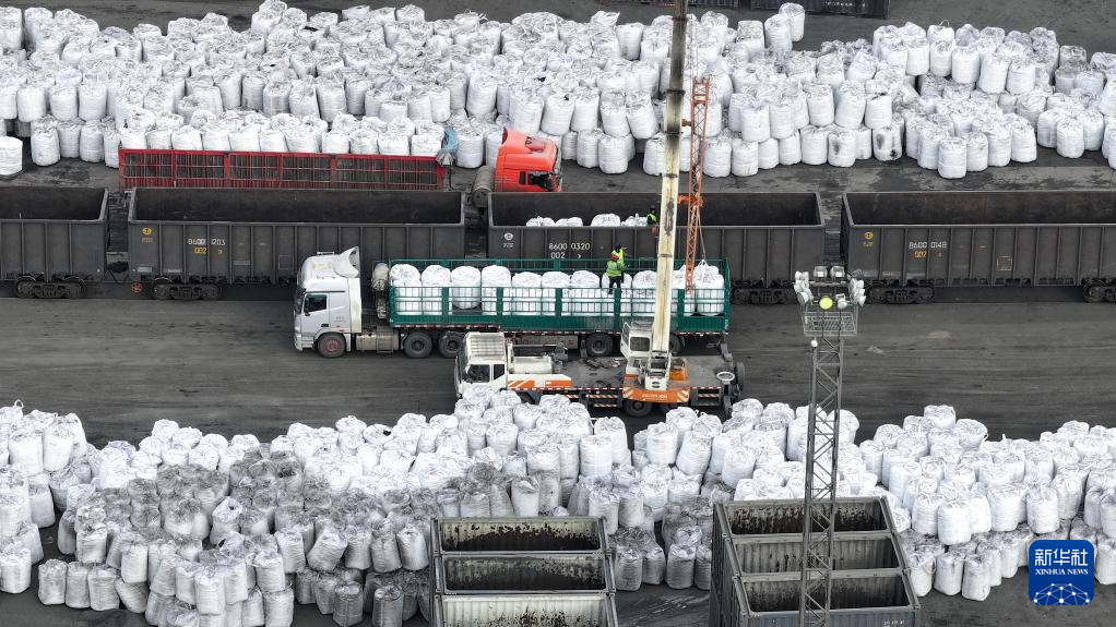 12月22日,在内蒙古二连浩特市,一列中欧班列在装货(无人机照片)。