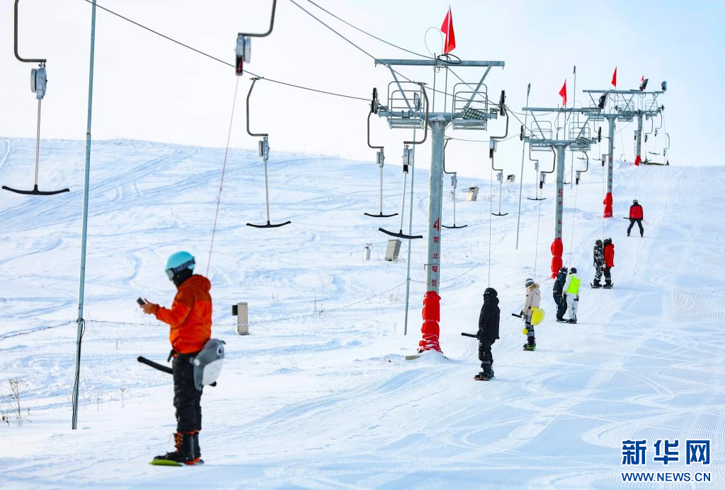 12月22日,游客在凤凰山滑雪场乘拖牵前往雪道。新华网发(康文魁 摄)