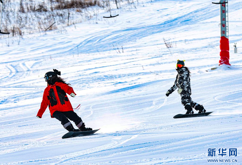 12月22日,3名来自四川的游客在凤凰山滑雪场滑雪。新华网发(康文魁 摄)