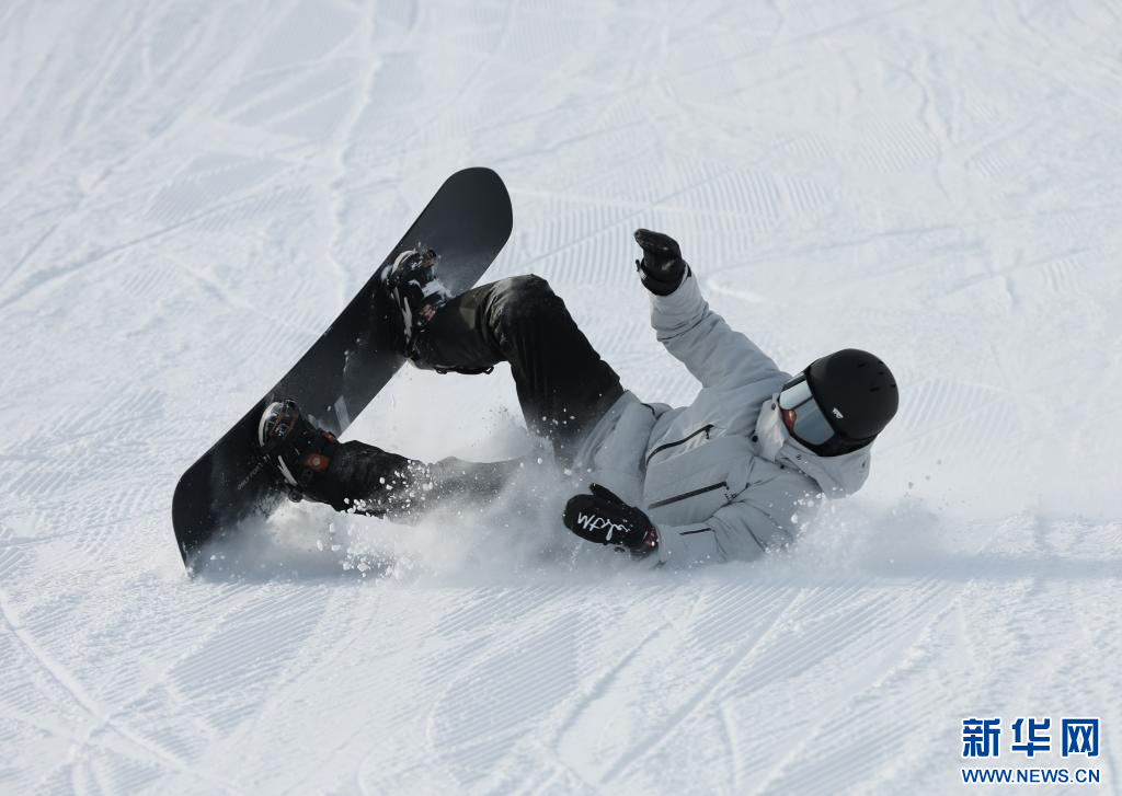 12月22日,滑雪爱好者在凤凰山滑雪场练习单板滑雪时摔倒。新华网发(康文魁 摄)