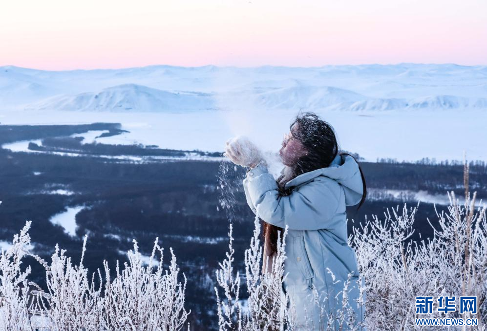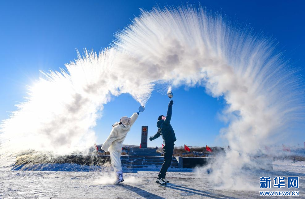 12月23日,游客在黑山头口岸景区体验泼水成冰。新华网发(康文魁 摄)