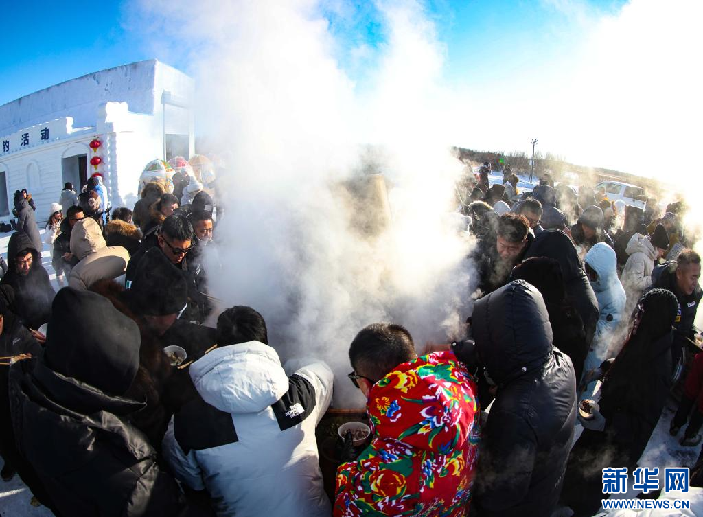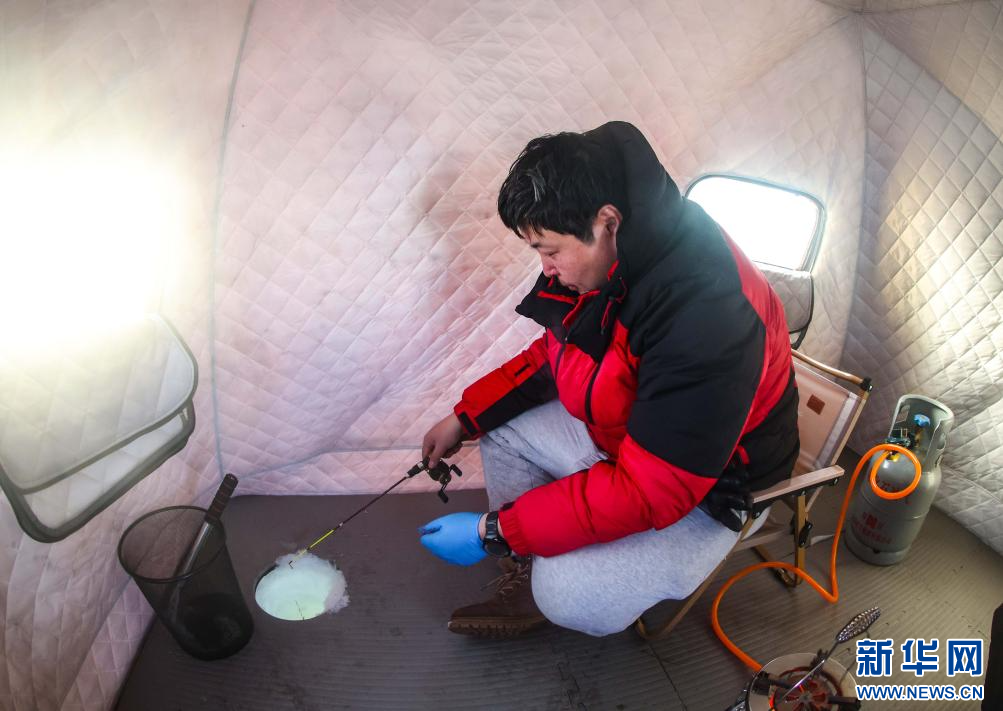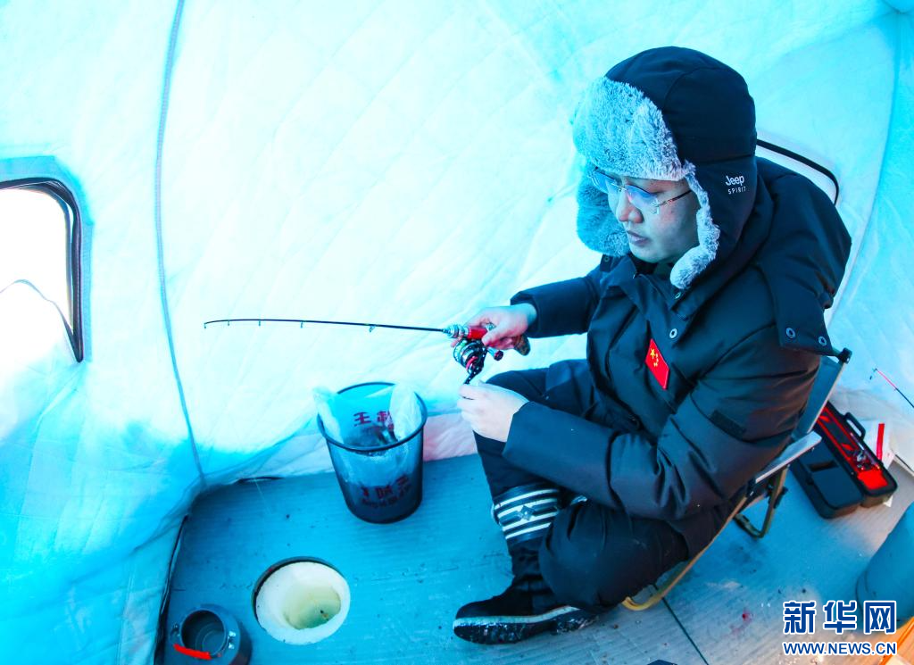 12月23日,游客在黑山头口岸景区暖帐内体验冰钓。新华网发(康文魁 摄)