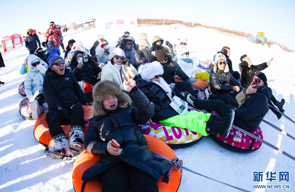 12月23日,游客在黑山头口岸景区体验拖拉机拉雪圈。新华网发(康文魁 摄)