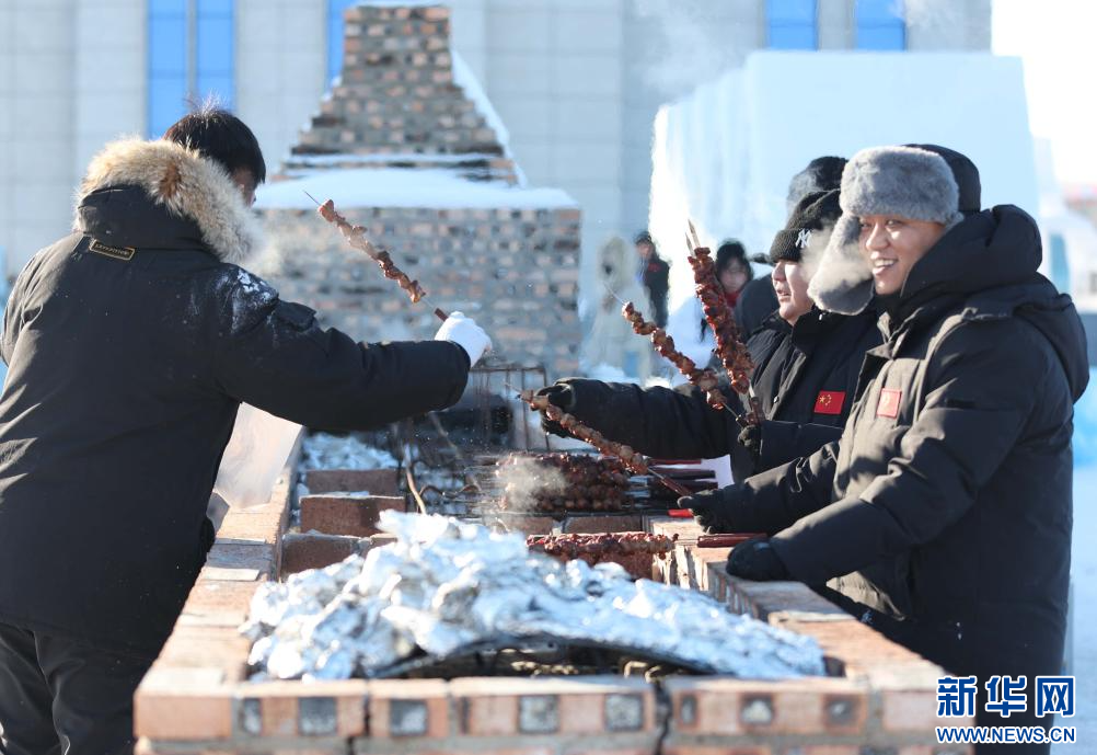 12月23日,游客在黑山头口岸景区就餐区品尝烧烤美食。新华网发(康文魁 摄)