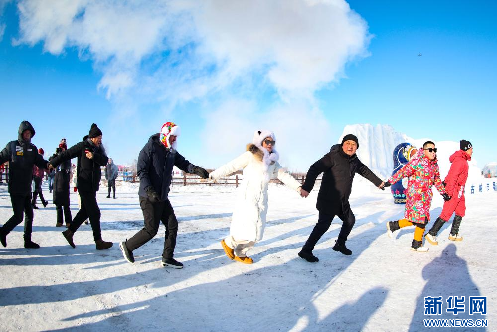 12月23日,游客在黑山头口岸景区冰钓区游玩。新华网发(康文魁 摄)