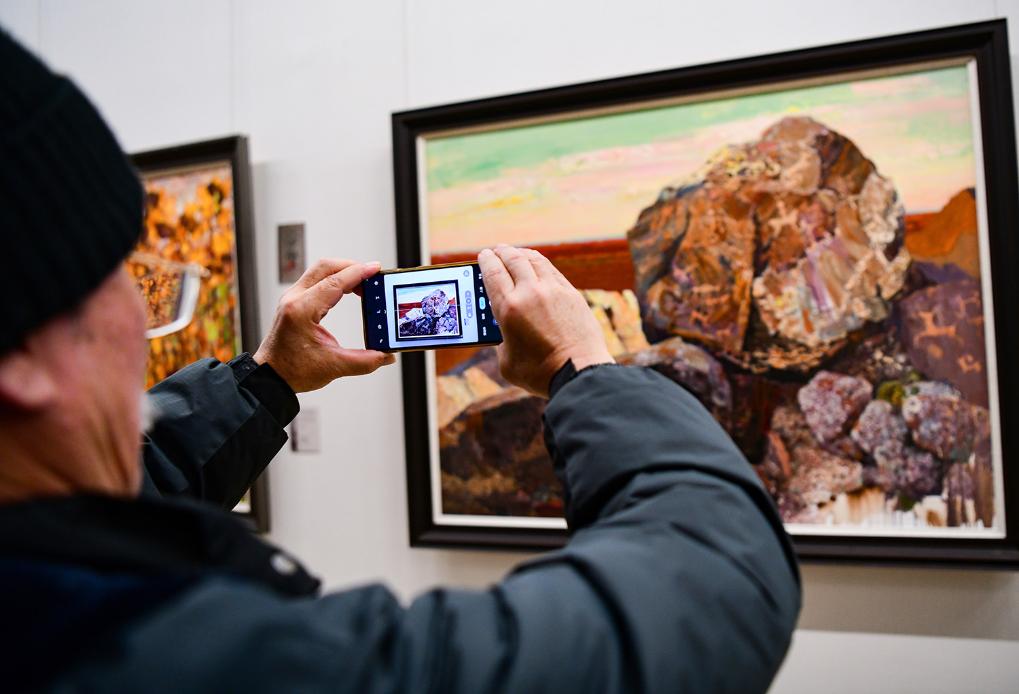 展览开幕式当天吸引了大批市民游客前来观展,年逾七旬的北京市民彭承元在观展的同时还认真拍摄了所有的参展作品。“这个展览办得很有意义,通过观看美术作品、拓片和现场播出的宣传片,我对有上万年历史的阴山岩画有了一定的了解,没想到巴彦淖尔会有这么大规模的文化遗迹。回去后会认真品鉴记录的每幅精美作品,也希望有机会能去实地观赏。”他感言道。