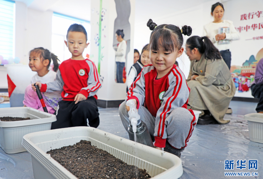 1月9日,在内蒙古自治区扎兰屯市繁荣办事处新风社区阳光农场,小朋友挖土种植蔬菜。新华网发(韩颖群 摄)