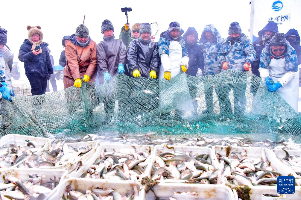 1月17日,渔民在达里湖冬捕现场收网。