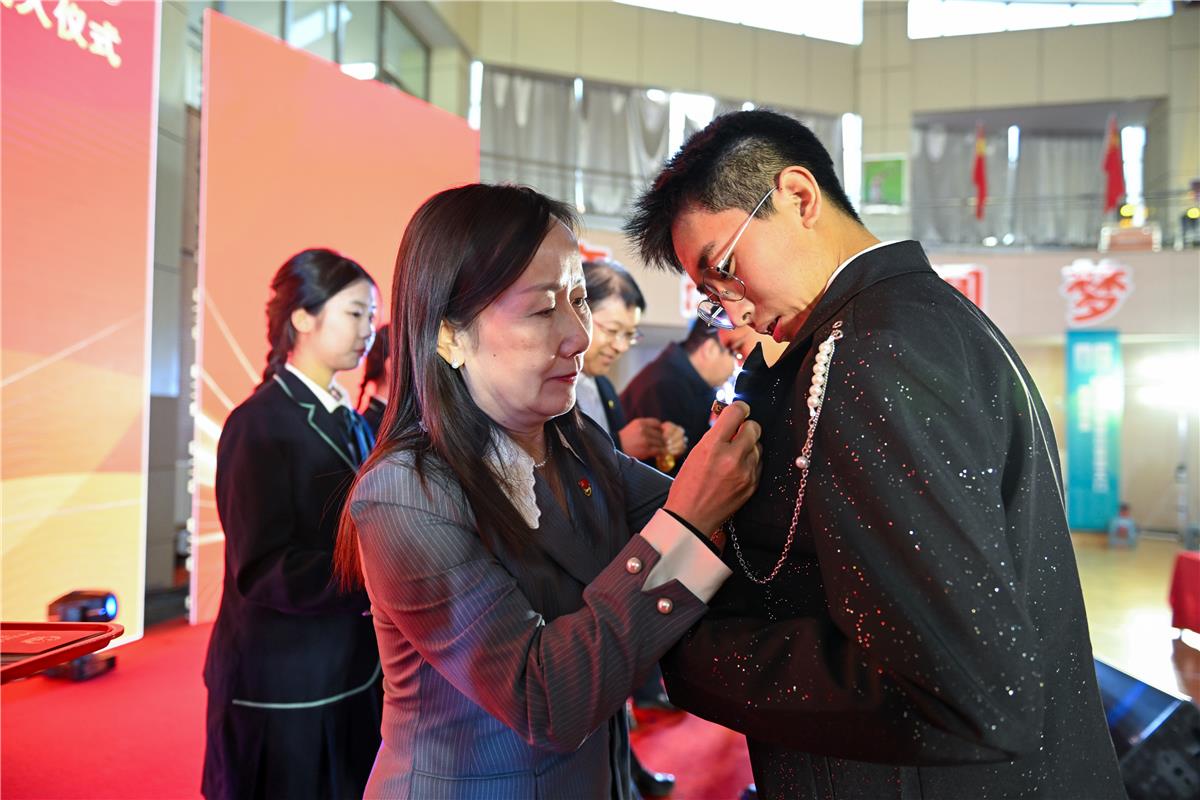 校长为学生佩戴徽章。