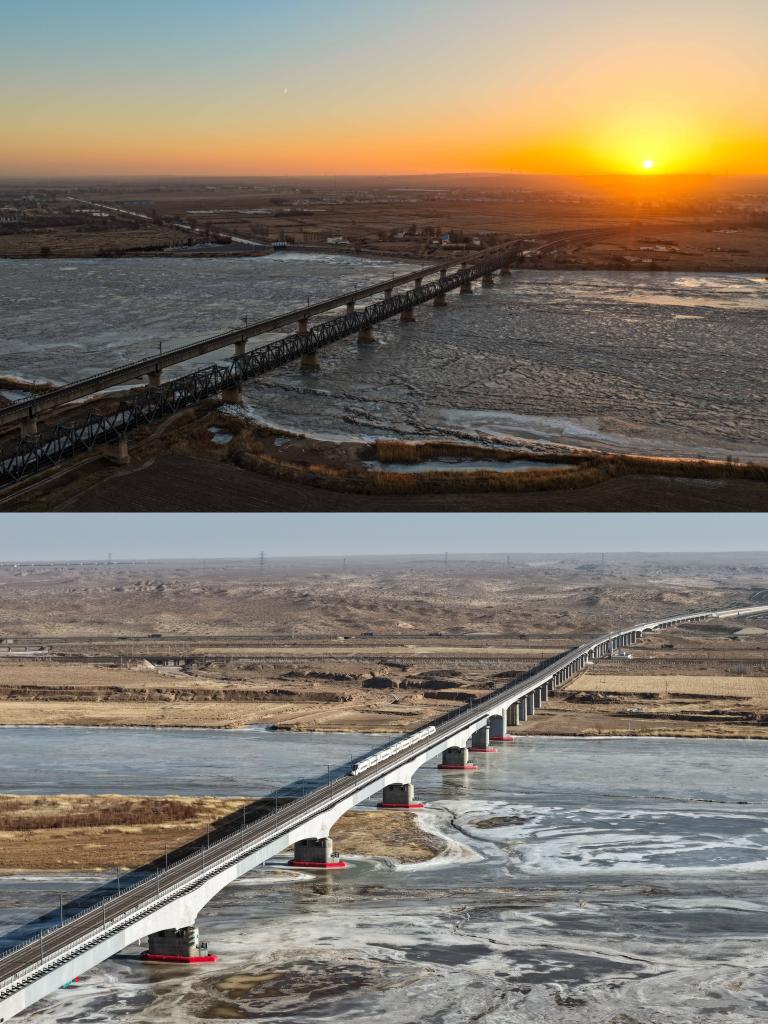 包兰铁路三盛公黄河铁路特大桥与包银高铁磴口黄河特大桥是中国铁路呼和浩特局集团有限公司乌海工务段管内的铁路桥。春运期间,为保障列车安全平稳运行,乌海工务段的桥隧工人加强了这两座大桥的巡检工作。