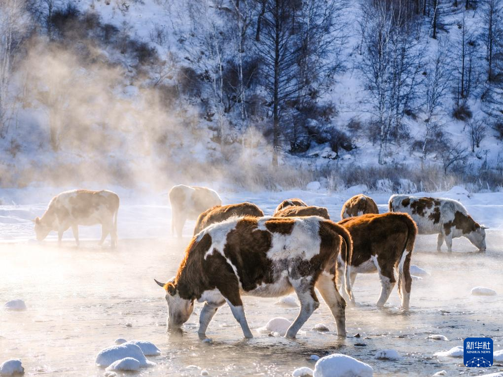 严寒中,不冻河岸边雾凇、氤氲白雾与饮水牛群,仿佛是童话世界里的绝美场景,吸引着游客争相打卡。旅拍摄影师李云生忙得“脚不沾地”,引导游客拍摄 “泼水成冰”、与牛群合影。