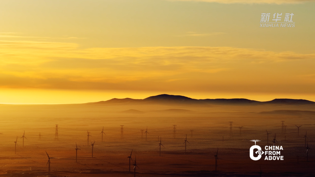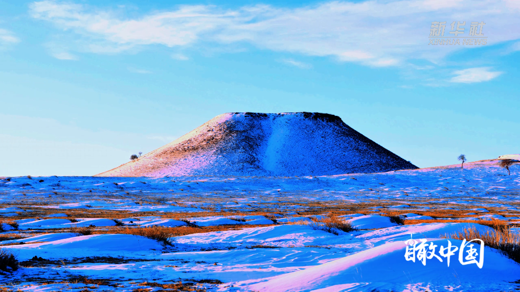 光影流转间,金黄色晨雾萦绕草原,风车在晨光中轻快转动。朝阳斜洒,平顶火山被霞光逐渐点亮,勾勒出草原版“日照金山”的壮丽画卷。