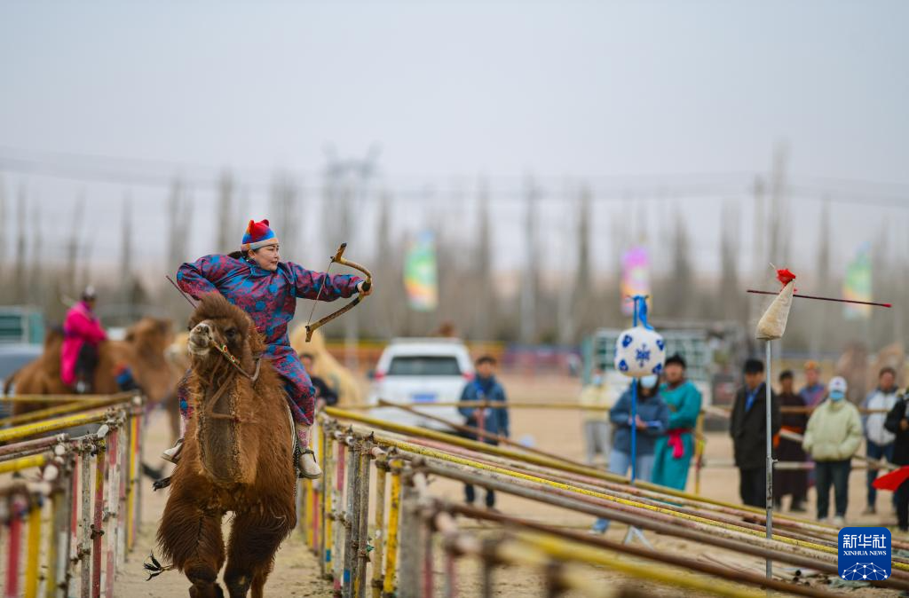 3月8日,弓箭手那生巴依尔在乘驼射箭比赛中。