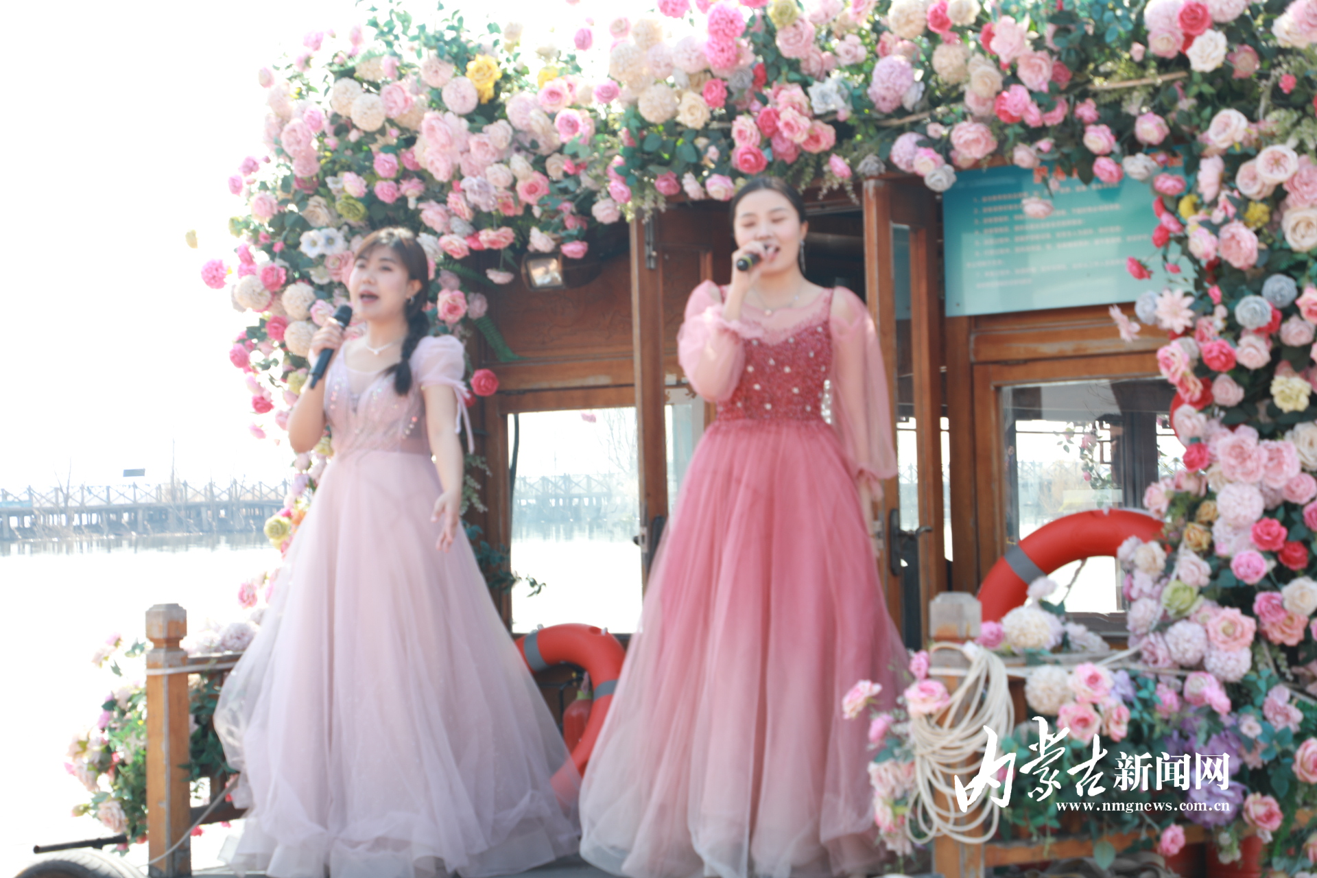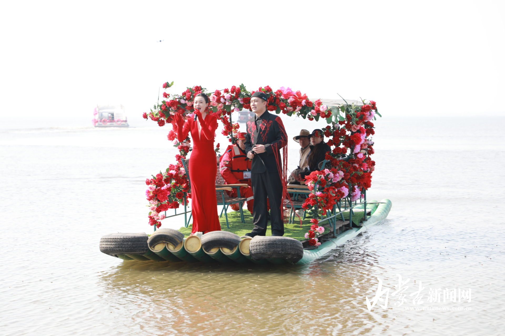 当日10时30分,开幕式在欢快的群舞《奈日》中拉开帷幕。值得一提的是,今年的歌舞表演带来了全新的沉浸式体验:乌兰牧骑的演员们乘船泛舟湖面,在碧水间缓缓驶来。经典歌曲《天下黄河九十九道弯》《哈素海我的故乡》接连上演,悠扬的歌声由远及近,伴着水波飘荡,与船上的舞蹈相得益彰,不仅展现了土默特左旗的民俗风情,更让游客在湖光山色中尽享视觉与听觉的双重盛宴。