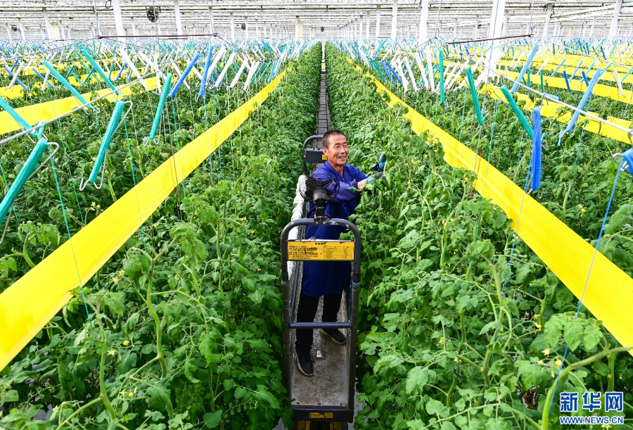 3月22日,工人在乌兰察布宏福农业产业园智能温室里管护番茄。新华网发(王正 摄)