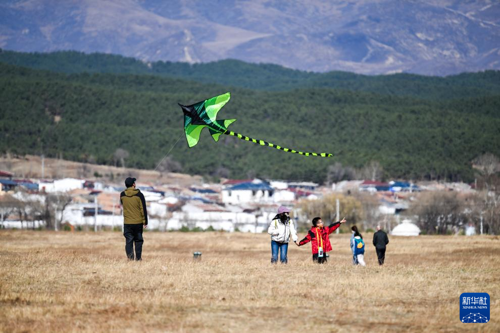 4月5日,人们在内蒙古呼和浩特敕勒川草原放风筝。新华社记者 连振 摄