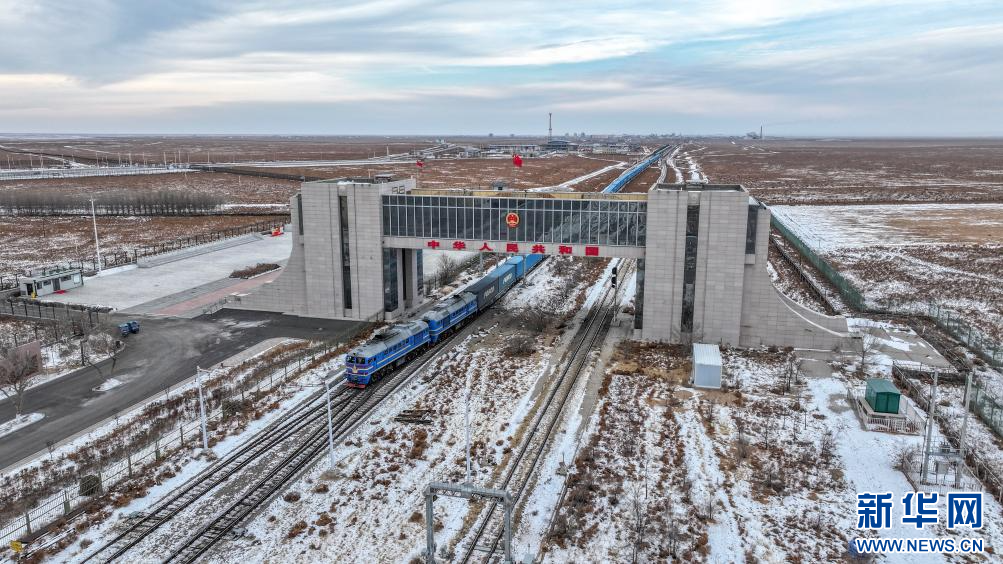2025年12月22日,一列中欧班列通过内蒙古二连浩特铁路口岸入境(无人机照片)。新华社记者 马金瑞 摄