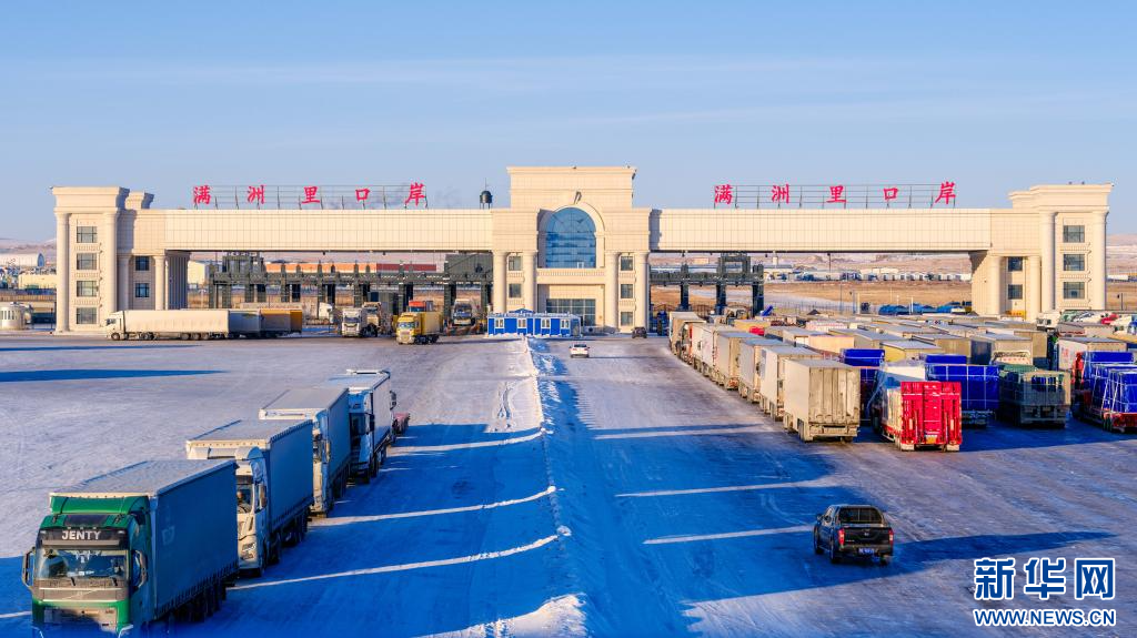 2025年12月23日,出入境货车排队通过满洲里公路口岸。 新华社记者 马金瑞 摄