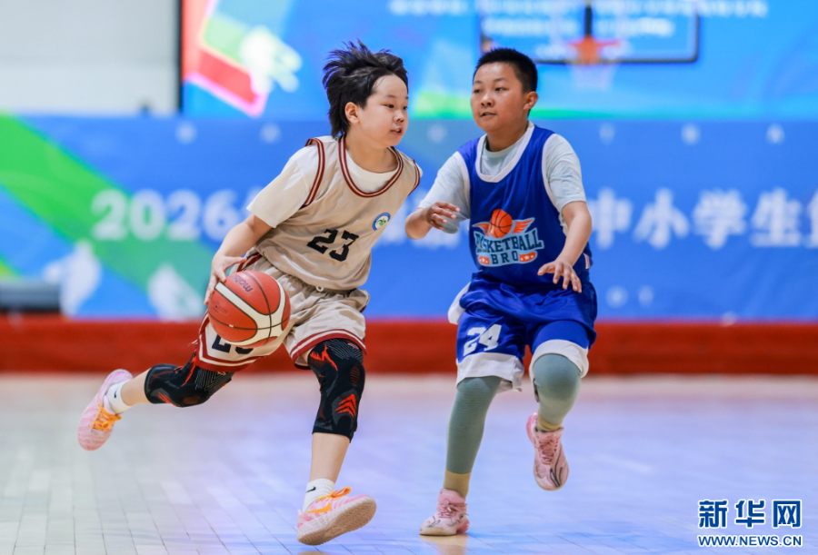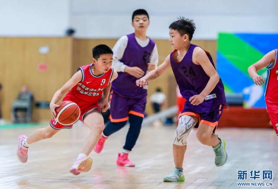 4月9日,内蒙古师范大学附属第三学校队球员(左)在小学男子组比赛中运球突破。新华网发(丁根厚 摄)