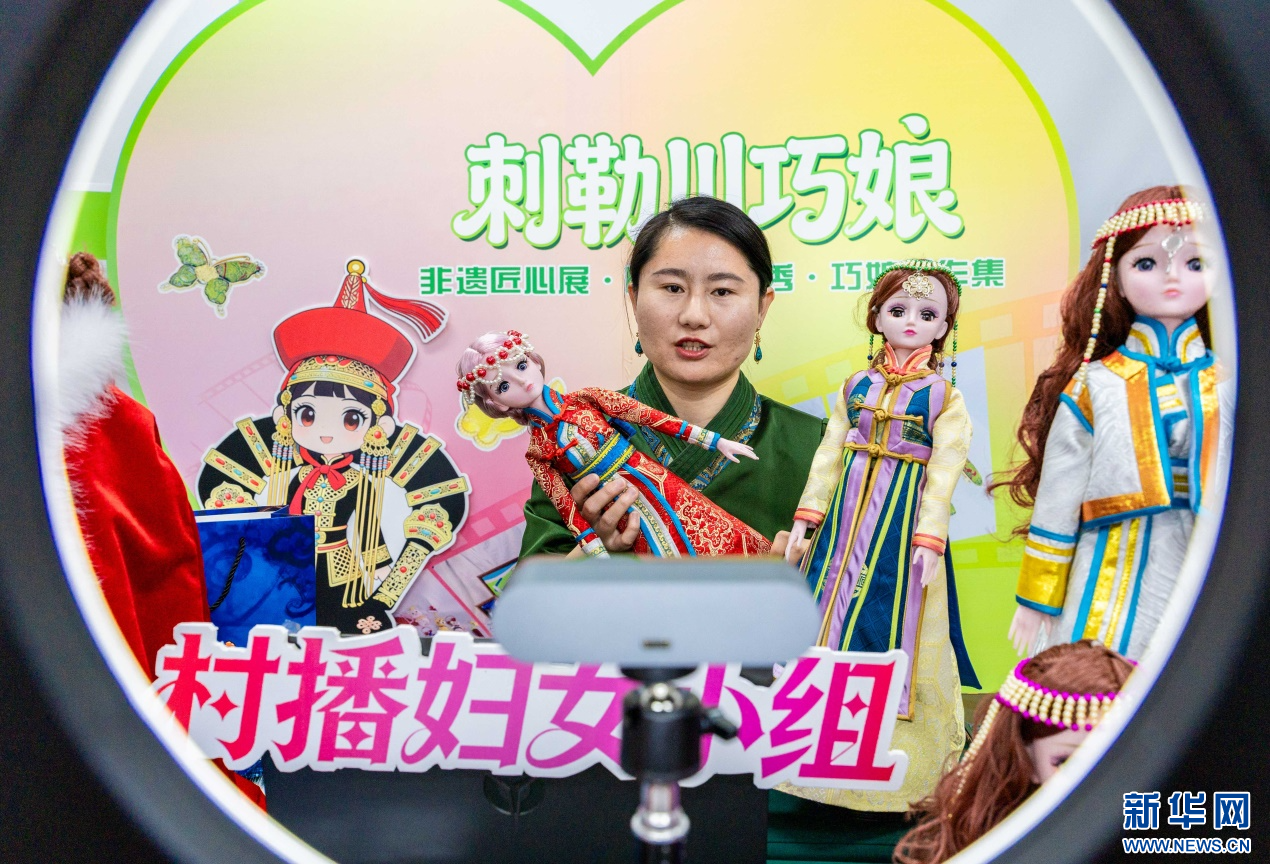 4月13日,呼和浩特市玉泉区妇联“村播妇女小组”的创业者在直播销售“敕勒川巧娘”民族特色非遗好物。新华网发(丁根厚 摄)