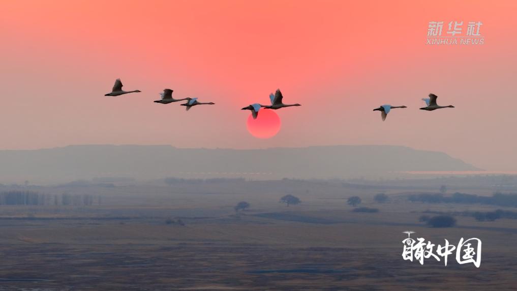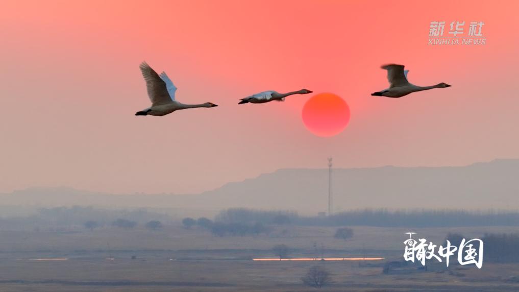 夕阳西下,内蒙古自治区兴安盟科尔沁国家级自然保护区的天际被染成浓烈的橘红。一轮红日悬于远方,朦胧的远山与辽阔湿地构成静谧底色,数只天鹅舒展羽翼,列队穿越霞光,勾勒出灵动弧线。