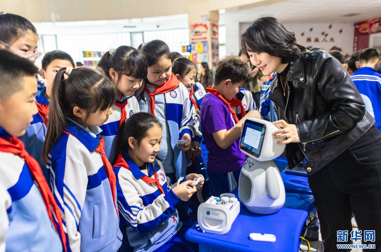 4月17日,呼和浩特市玉泉区通顺街小学第一届校园科技节活动现场,学生们与机器人开心互动。新华网发(丁根厚 摄)