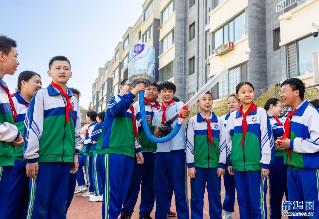 4月17日,呼和浩特市玉泉区通顺街小学第一届校园科技节活动现场,学生们在体验空气炮项目。新华网发(丁根厚 摄)
