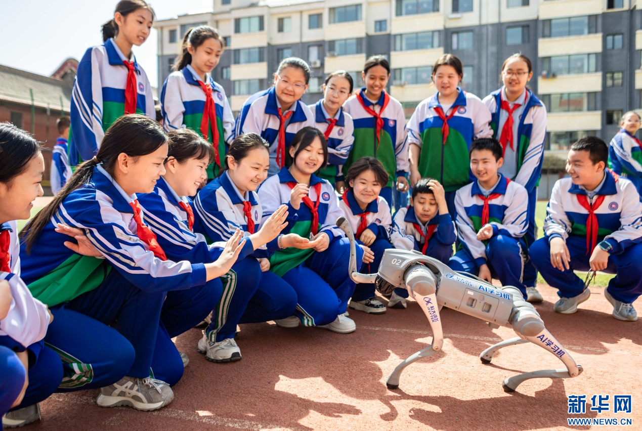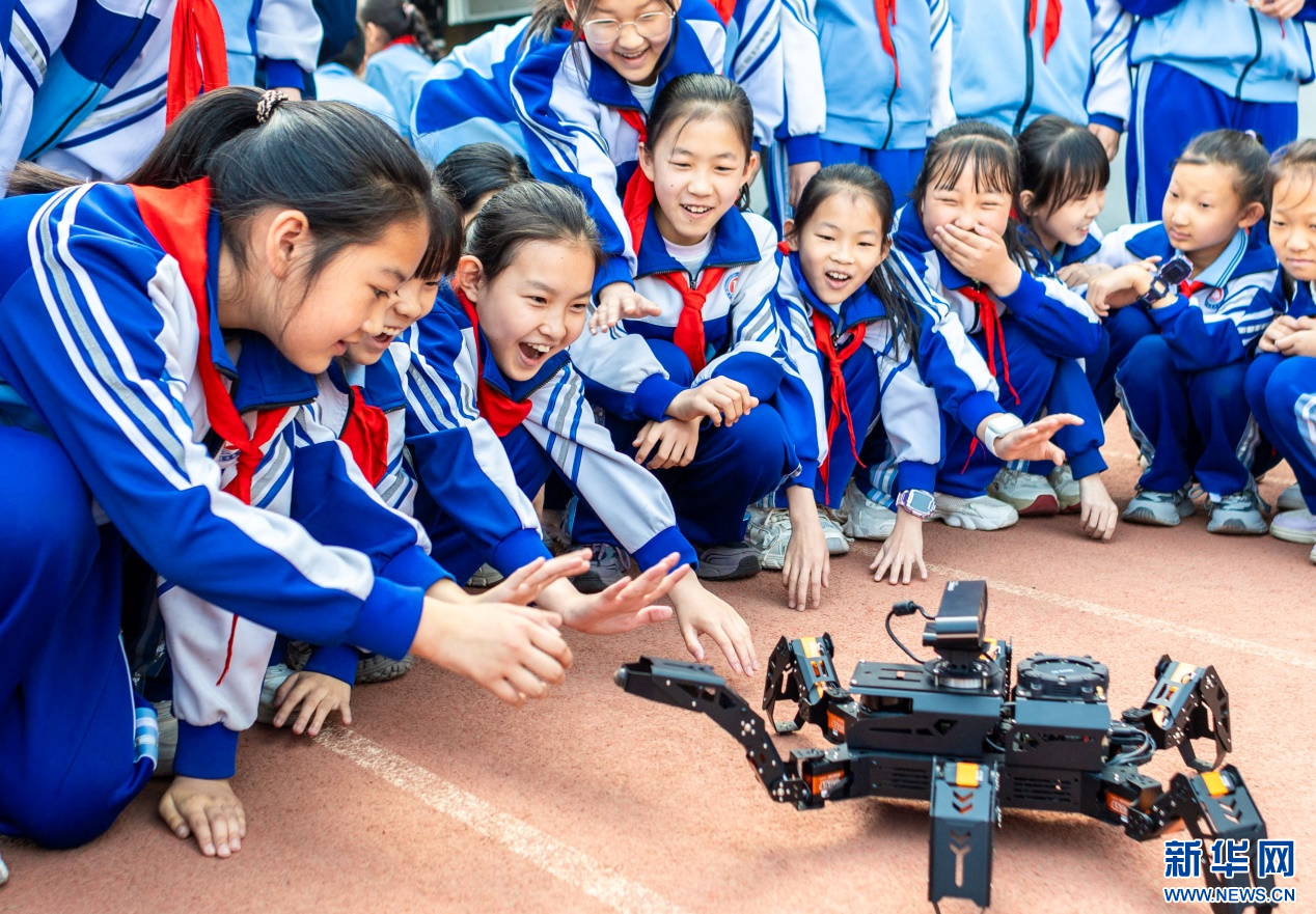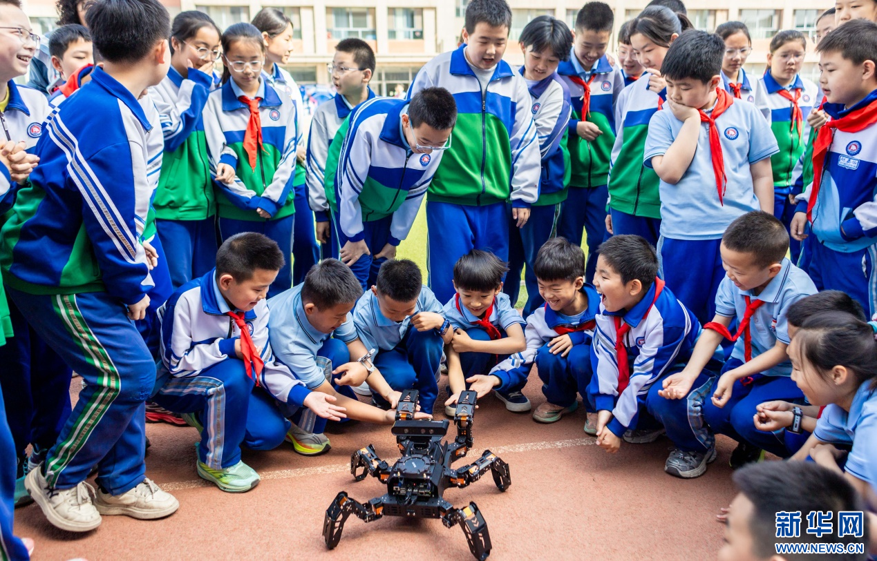 4月17日,呼和浩特市玉泉区通顺街小学第一届校园科技节活动现场,学生们与四足机器人互动。新华网发(丁根厚 摄)