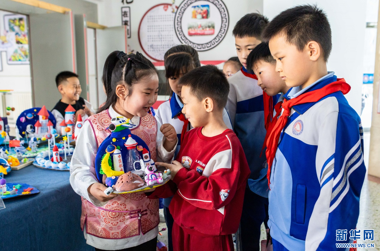 4月17日,呼和浩特市玉泉区通顺街小学第一届校园科技节活动现场,学生们在参观科技手工作品展。新华网发(丁根厚 摄)