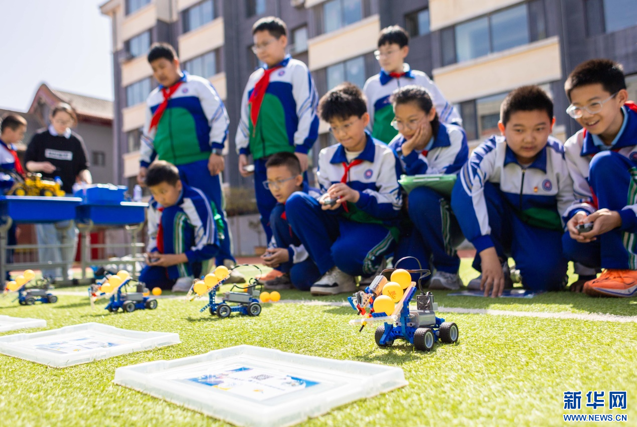 4月17日,呼和浩特市玉泉区通顺街小学第一届校园科技节活动现场,学生们操控编程机器人完成挑战任务。新华网发(丁根厚 摄)