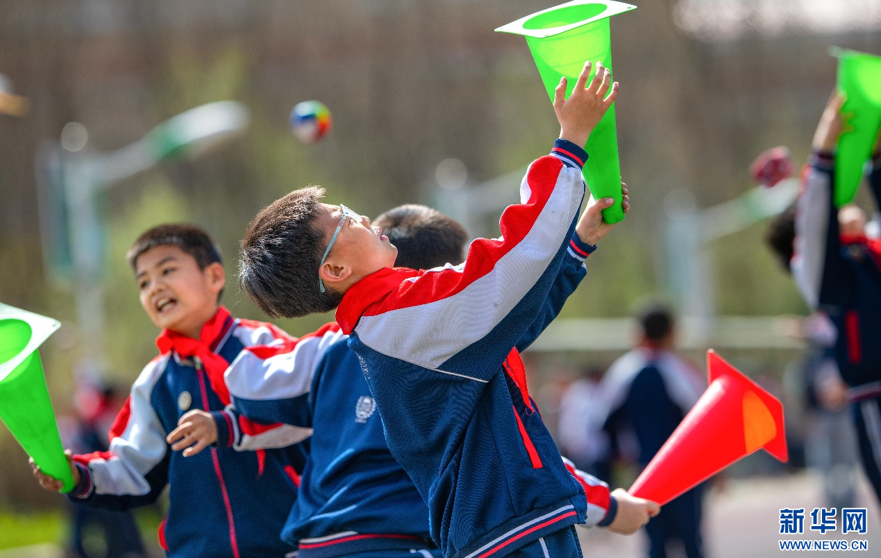 4月17日,呼和浩特市赛罕区腾飞路小学学生在大课间参加掷沙包趣味游戏。新华网发(王正 摄)