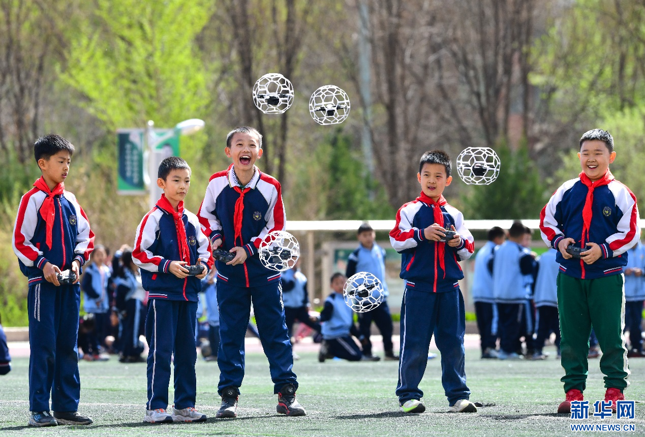 4月17日,呼和浩特市赛罕区腾飞路小学学生在大课间参加无人机趣味运动。新华网发(王正 摄)
