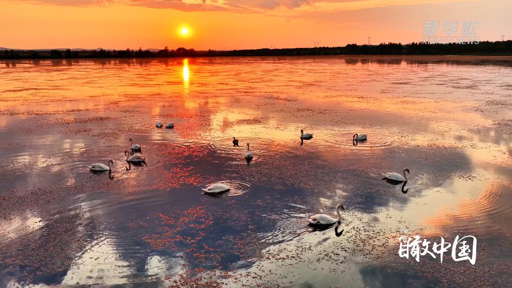 日落时分,在内蒙古自治区兴安盟科尔沁右翼中旗代钦塔拉苏木,澄澈的湖水倒映着远山与霞光,水天之间一片祥和。