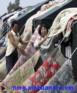村民在晾晒下雨受潮的被褥