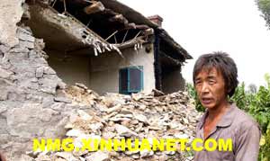 村民江军在自家受震破损的房屋前