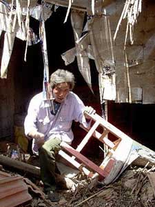 灾民在倒塌的房屋前清理被埋的家具