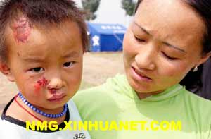 受伤的小刘健和母亲在救灾帐篷前